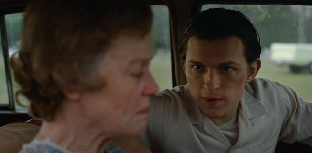 Si en algo destaca El Diablo a Todas Horas es en su reparto, lleno de estrellas del nuevo milenio. Ahí está Tom Holland como el protagonista principal, en su rol más desafiante desde que filmó Lo Imposible cuando era apenas un adolescente. El carrusel de emociones y la lucha contra el destino marcan al personaje y exigen de Holland algo más que un sentido arácnido para actuar. En líneas generales, cumple satisfactoriamente y se echa al hombro dos tercios de película.